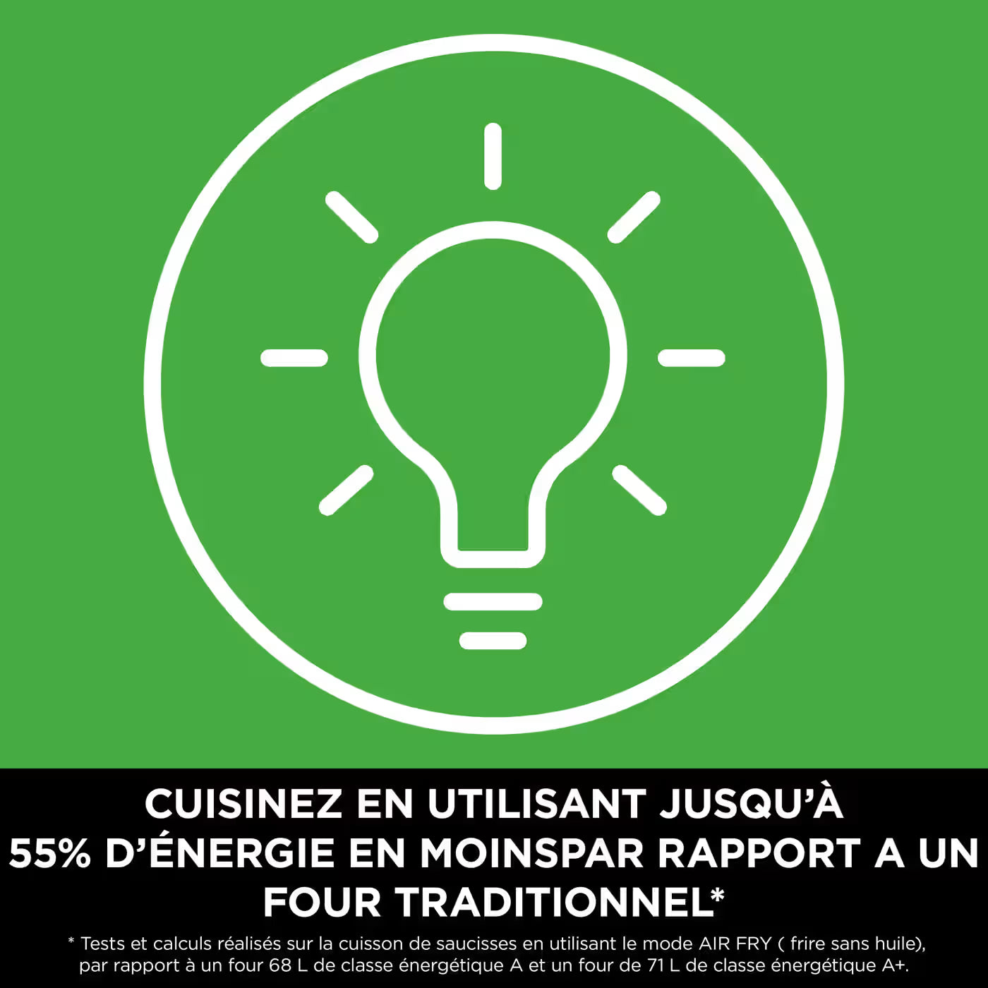 Faites frire vos aliments préférés en utilisant peu ou pas d'huile - jusqu'à 75 % de matières grasses en moins que les méthodes de friture traditionnelles4. Plus qu'une friteuse, vous pouvez également rôtir, cuire au four, déshydrater, réchauffer et cuire des aliments surgelés jusqu'à ce qu'ils soient extra-croustillants grâce à Max Crisp. De plus, la cuisson avec cette friteuse utilise jusqu'à 55 % d'énergie en moins qu'un four†, ce qui rend son fonctionnement économe en énergie.